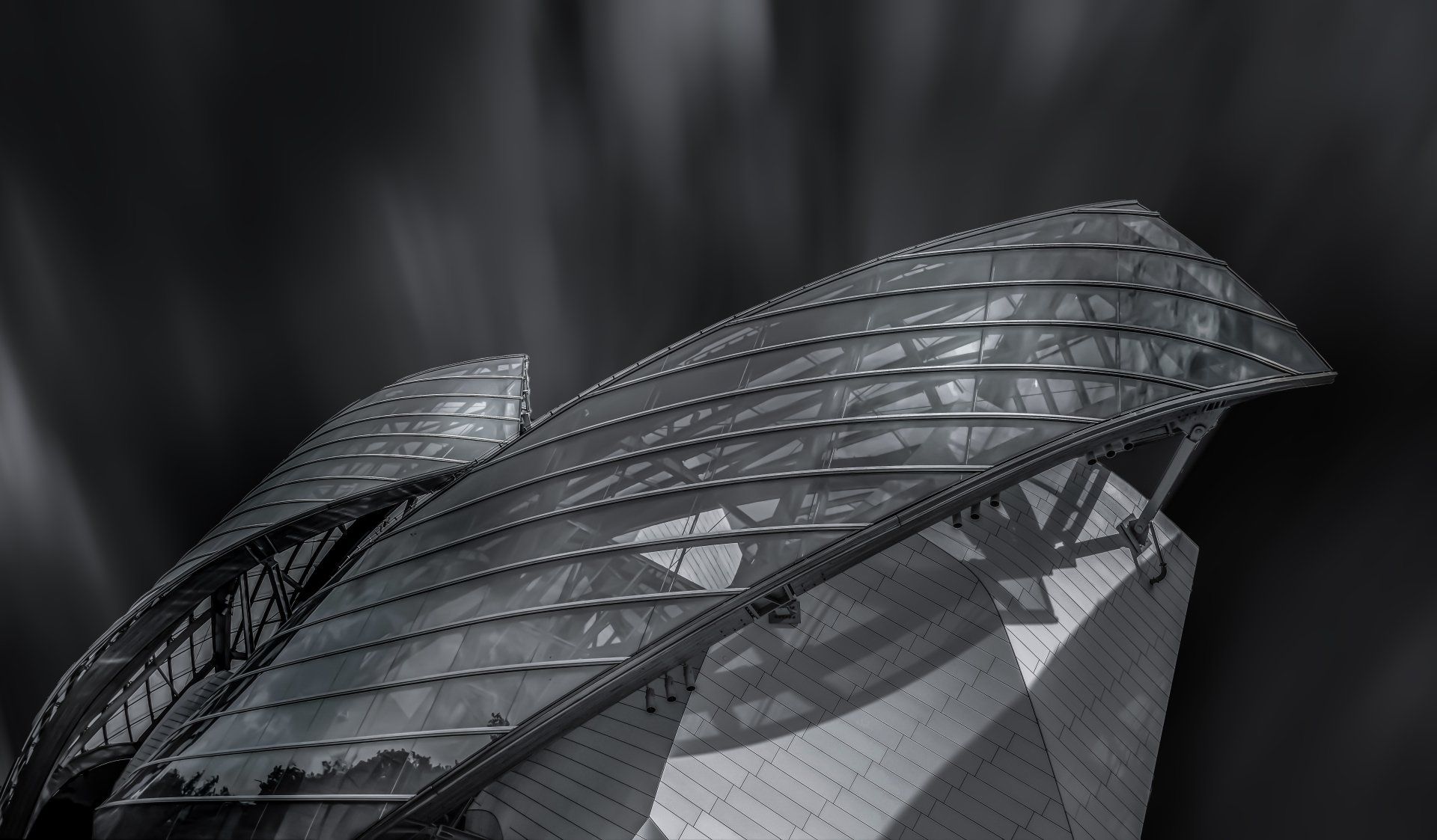 Die Stiftung Louis Vuitton ist ein 2014 eröffnetes Privatmuseum in Paris und zeigt meist Werke des 20. Jahrhunderts. Die Fassade besteht aus einer Ansammlung weißer Blöcke (bekannt als „die Eisberge“), die mit Paneelen aus faserverstärktem Beton verkleidet sind und von 12 riesigen Glassegeln umgeben sind, die von Holzbalken getragen werden. Die Segel verleihen dem Fundament Transparenz und Bewegungsgefühl, während das Gebäude Wasser, Wald und Garten reflektieren und sich mit dem Licht ständig verändern kann.