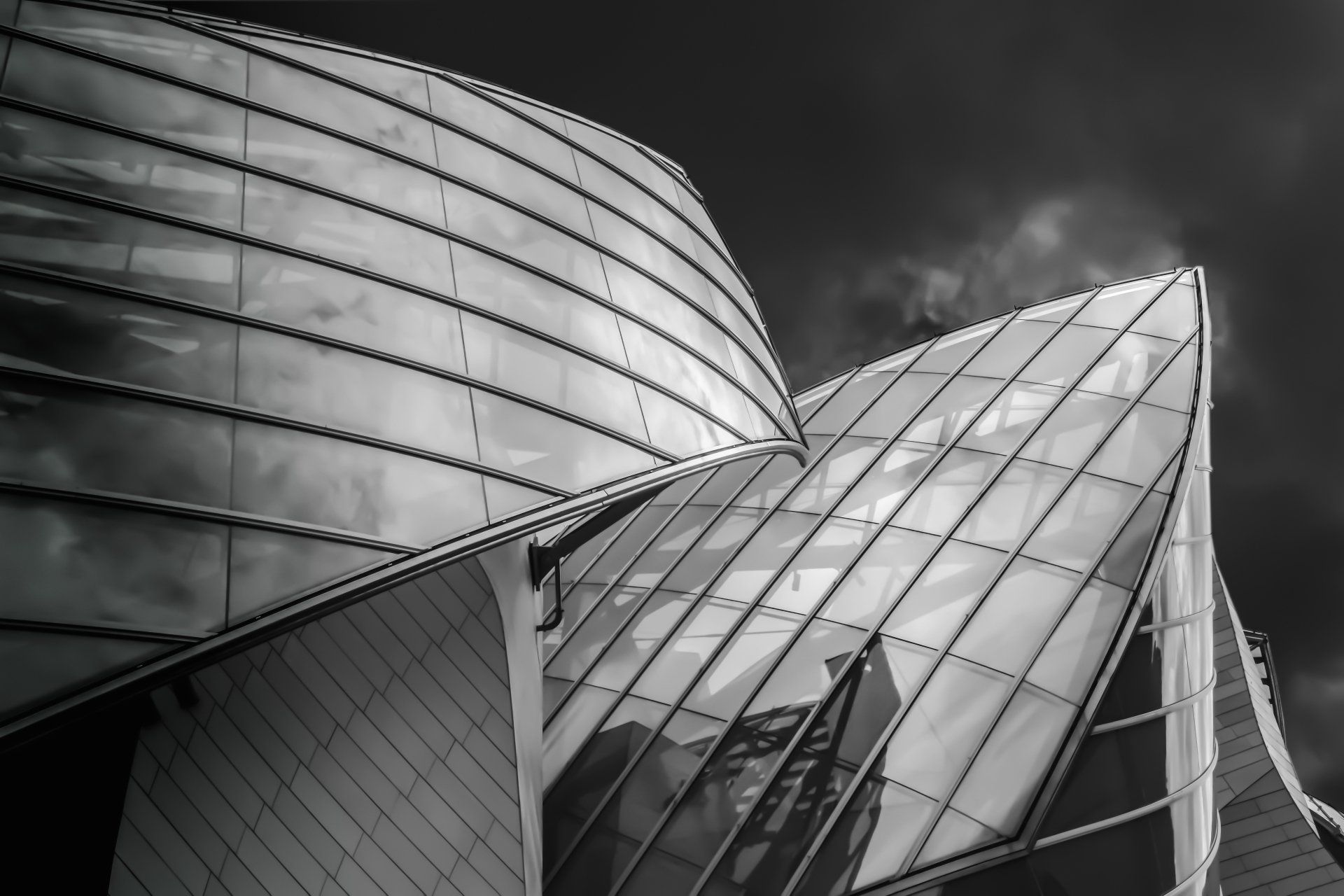 Die Stiftung Louis Vuitton ist ein 2014 eröffnetes Privatmuseum in Paris und zeigt meist Werke des 20. Jahrhunderts. Die Fassade besteht aus einer Ansammlung weißer Blöcke (bekannt als „die Eisberge“), die mit Paneelen aus faserverstärktem Beton verkleidet sind und von 12 riesigen Glassegeln umgeben sind, die von Holzbalken getragen werden. Die Segel verleihen dem Fundament Transparenz und Bewegungsgefühl, während das Gebäude Wasser, Wald und Garten reflektieren und sich mit dem Licht ständig verändern kann.